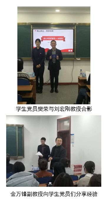 此次分享会的主要内容是,首先外国语学院本部本科生联合党支部书记方鑫做主题发言,欢迎四位优秀党员教师莅临现场,引导支部学生党员向优秀党员教师学习;第二部分内容是六名支部党员学生代表发言,结合分享会主题发表了“我心中的好老师”的演讲,学生党员代表分享了与老师朝夕相处时,他们感受到的来自老师的幽默风趣,或严厉批评,或耐心鼓励,或悉心呵护,将老师所做的平淡小事带给自己学业上和心灵上的感染,富有真情实感地表达出来,并在现场表达对老师的感谢与感恩,立志以他们为学习榜样;第三部分是优秀党员教师分享自己的感受与经验,教师们纷纷鼓励学生再接再厉,为今后的学业和事业努力拼搏;第四部分是学生党员向优秀党员教师献礼,并合影留念。
