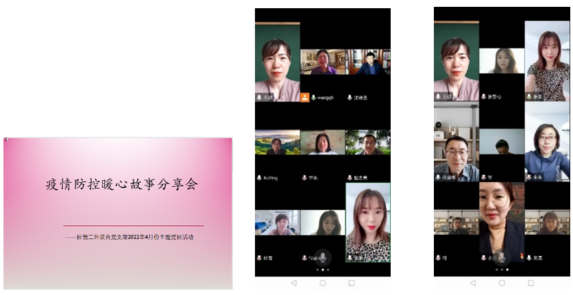 基于上述背景,2022年4月13日下午,日俄二外联合党支部召开了线上“疫情防控”暖心故事分享会。参加会议的有日俄二外联合党支部全体党员、预备党员和各位系室主任,会议由支部书记王清华主持。首先王清华简单说明了本次故事分享会的目的和意义,然后教师们有序而积极主动地真情分享了居家工作期间亲身经历和感知的暖心故事。教师们分享的,既有长春有难,八方支援的爱心故事,也有单位领导、同事勇于担当、驻扎疫情防控一线的暖心故事;既有白衣天使兢兢业业,迎风冒雪阻断疫情的决心故事,也有左邻右舍互帮互助、互通有无的真情故事。