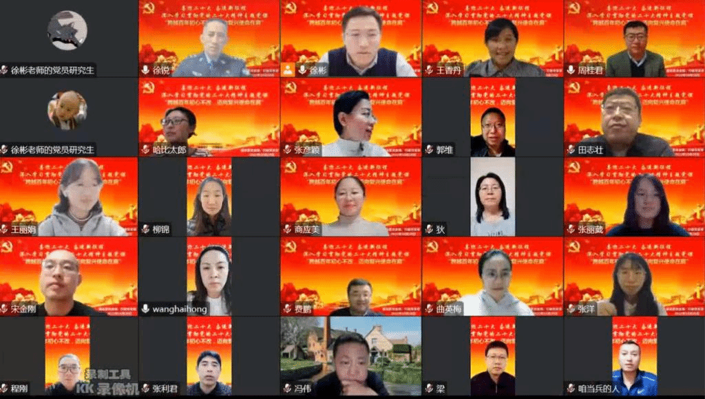 为深入学习贯彻党的二十大精神,2022年10月28日19时30分,借助腾讯会议平台,东北师范大学外国语学院英语系党支部书记徐彬教授和行政党支部书记王香丹老师联合主持举办了以“跨越百年初心不改,迈向复兴使命在肩”为题的主题党日活动。本次主题党日活动特邀主讲人是山东省公安厅反恐怖总队副总队长兼情报支队支队长、山东省第十二次党代会代表徐锐警官。