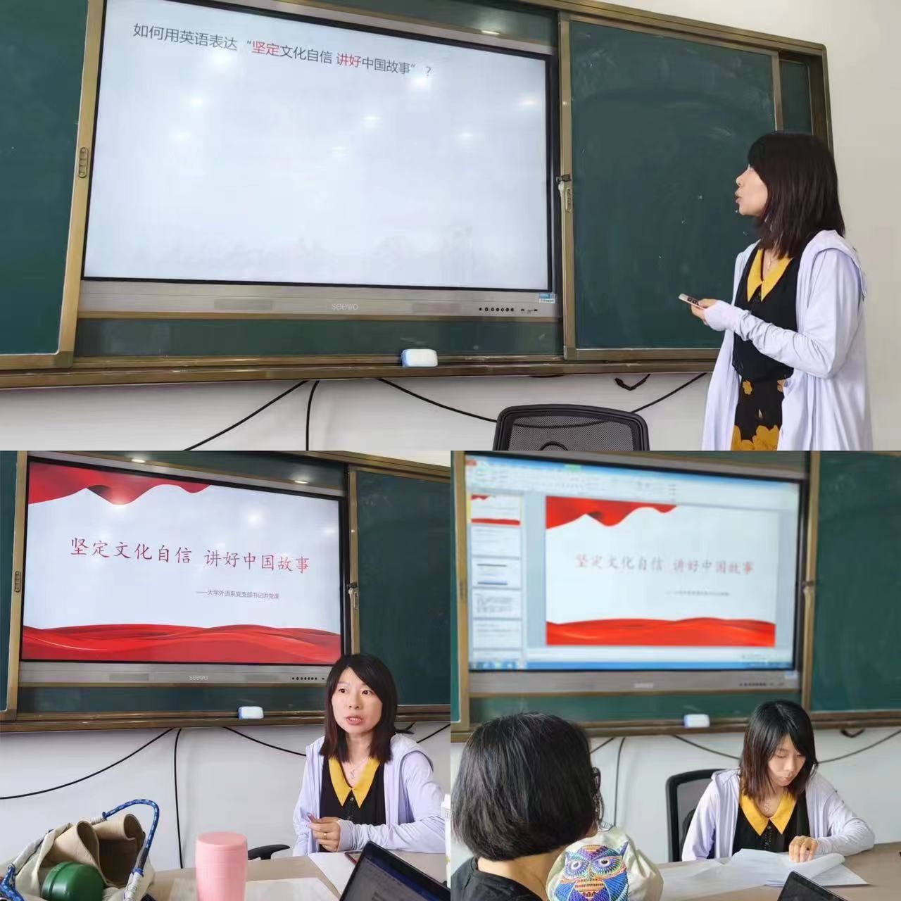 接下来,李茶书记讲授了“坚定文化自信,讲好中国故事”的主题党课。首先,李茶书记以互动的方式提出问题:“如何用英语表达‘坚定文化自信,讲好中国故事’”,并明确了文化自信的内涵及其与其它三个自信,即道路自信、理论自信、制度自信的关系。最后,结合具体课例,党员教师们纷纷结合自身工作特点,讨论作为高校教师如何在教学活动中引导学生坚定文化自信,并用英文讲好中国故事。