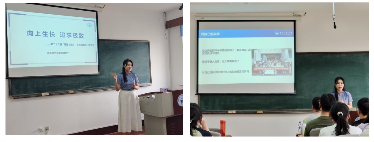 本次宣讲活动分为经验分享和同学提问两大部分。首先,由马克思主义学部侯力宁进行经验分享。她以个人经历为例,分享了自己面对不同处境的心态,讲述了自己学习和生活中的重要转折点。她用“自信”、“尝试”和“平和”三个关键词向同学们传达了经验,鼓励同学们能够树立对学科和生活的自信,并用接纳与热爱去不断尝试,在忙碌的生活中保持积极而平和的心态。