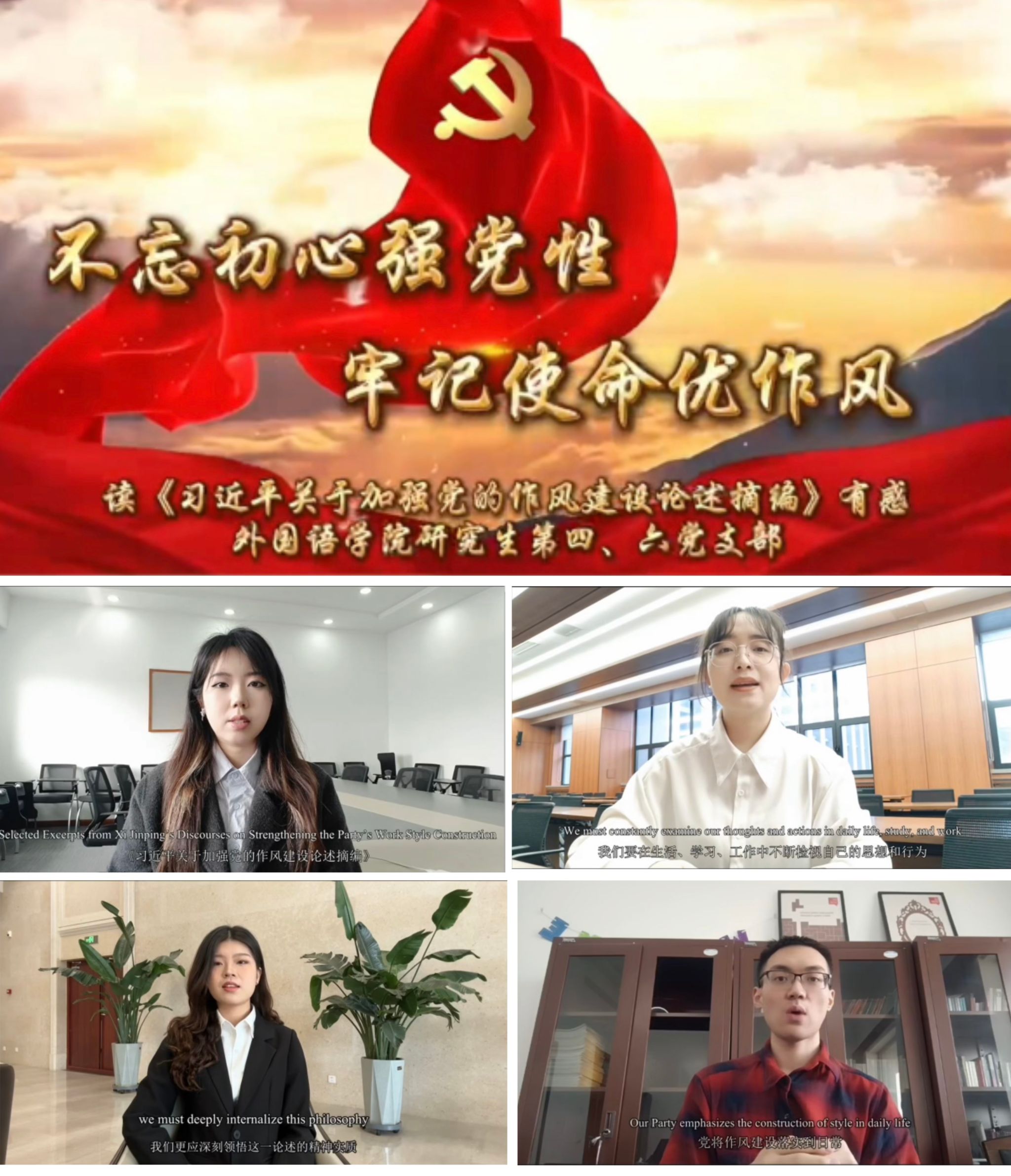 研究生党支部全体党员在支部书记的带领下,深入学习了《习近平关于加强党的作风建设论述摘编》的内容。本次读书会依托外语专业优势,采用“多语种领学+支部共读”的形式,以关键少数带动绝大多数,鼓励全体支部党员和发展对象从外语青年视角出发,读原著、学原文、悟原理,深入理解“党的作风”的性质和重要性,深入贯彻落实中央八项规定精神,带领全体党员筑牢思想之基、践行青春梦想。此次读书会多语种全覆盖、形式新颖、内容丰富,进一步强化了全体党员对党的作风建设重要性的认识。学习后,同志们纷纷表示,要以习近平总书记关于党的建设的重要思想为指导,始终牢记初心使命,在学习实践中强化党性修养,在生活历练中增长才干,以作风建设为基础,勇担外语青年立身、立言、立德、立业的使命。