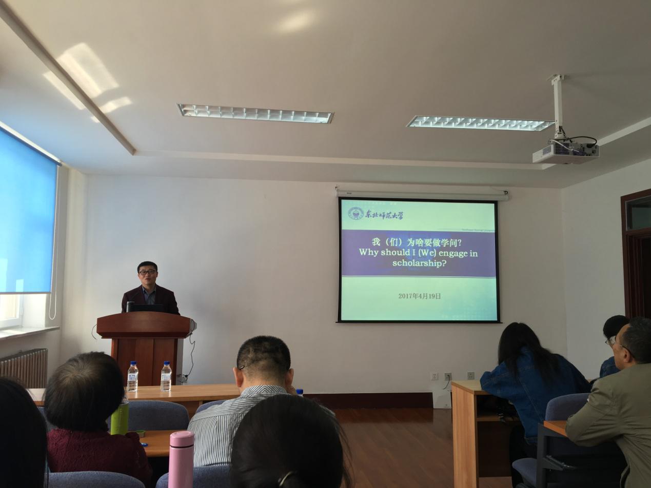 4月19日下午, 外国语学院周桂君教授在外国语学院701教室为学院师生作了“东师外语致知讲坛”系列讲座的第二讲“我(们)为啥要做学问?”。讲座由外院青年学者朱海峰老师主持,大学外语系教师及研究生参加了此次学术报告。