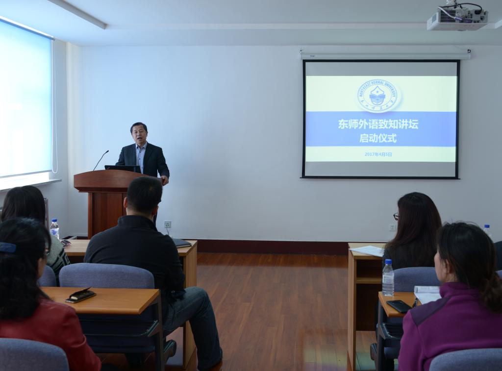 4月5日下午,外国语学院“东师外语致知讲坛”启动仪式暨第一讲“外语教育研究的选题与研究方法”在本部外语教学楼701多媒体教室举办。