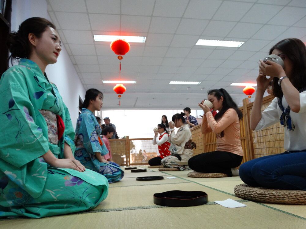 今年的文化祭同往年一样,也分为两个部分,文化体验和节目欣赏。文化体验的部分是由日语系的外教老师和外籍嘉宾老师指导展示茶道、剑道、和食、和服等日本的传统文化,同学们可以坐在榻榻米上欣赏茶道的制作过程,品尝正宗的和果子和日本茶,也可以观看正宗的剑道表演,还可以品尝由日语系同学制作的寿司和味增汤,穿上日本传统的和服与小伙伴们合影留念。