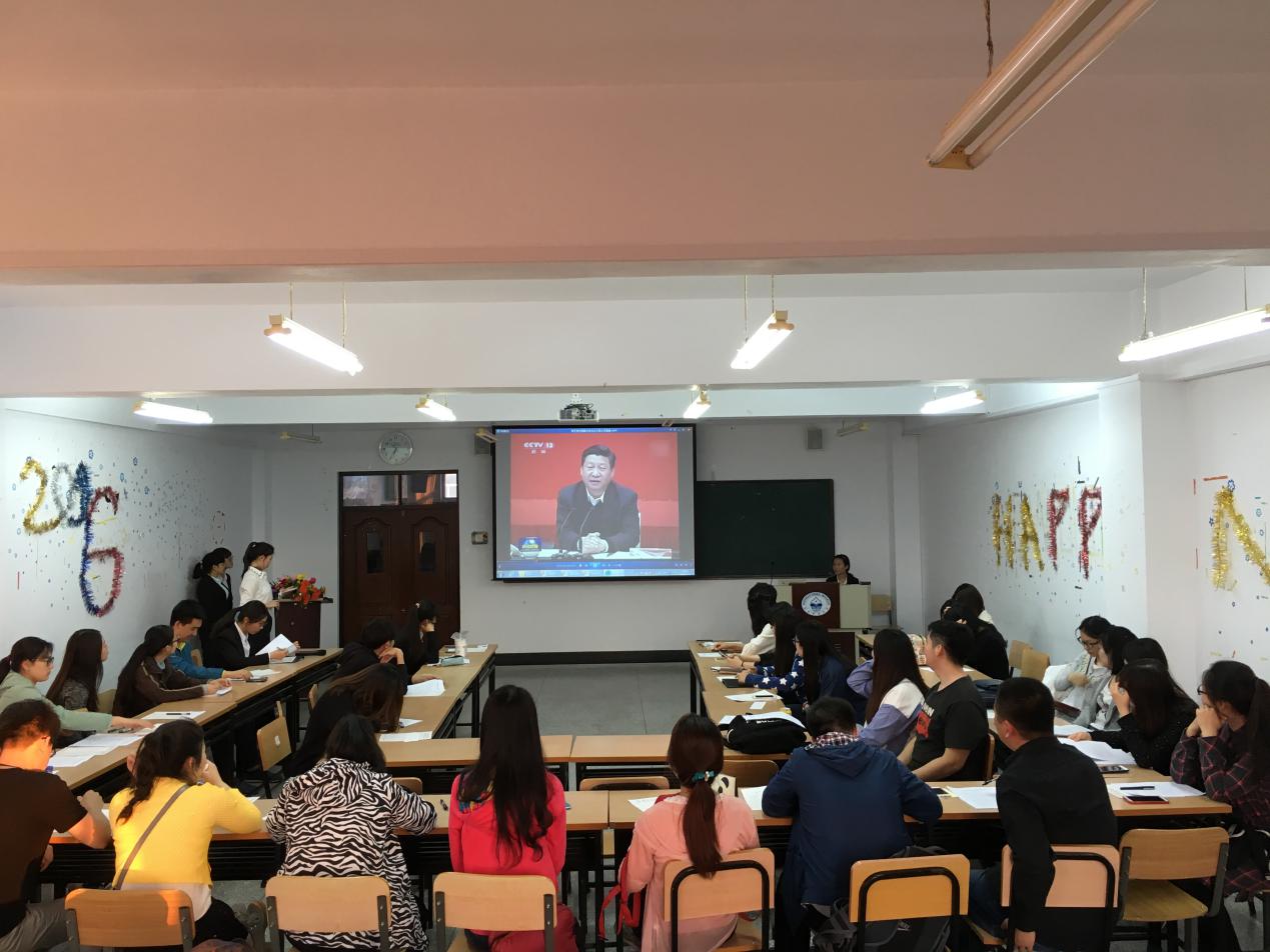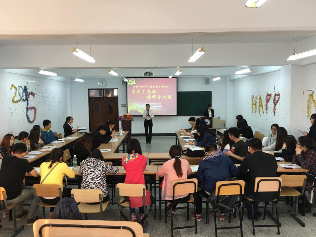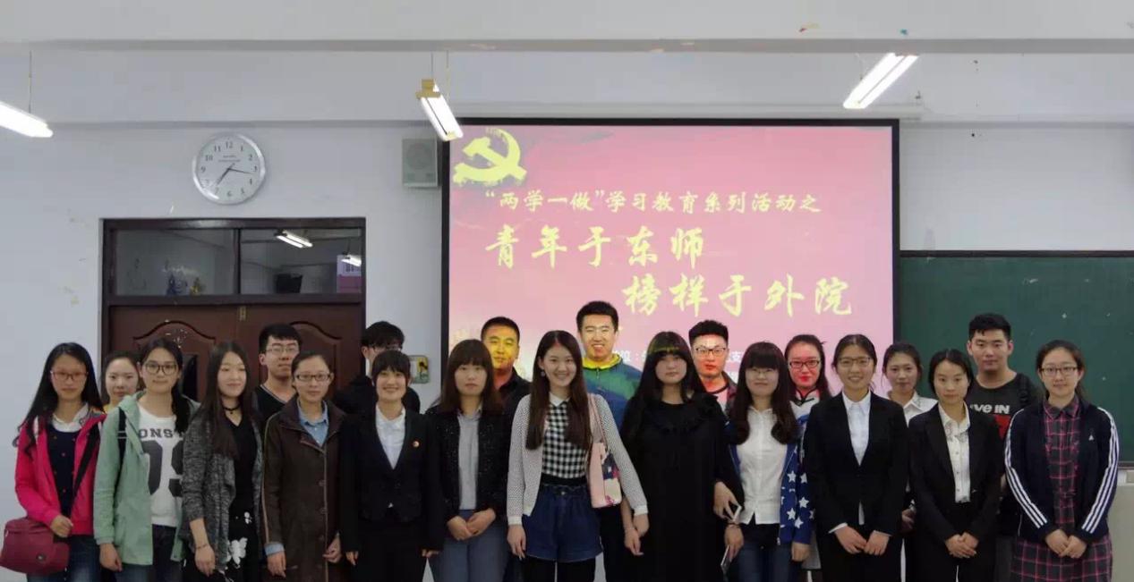 2016年5月25日,东北师范大学外国语学院“两学一做”系列活动之——“青年于东师,榜样于外院”主题座谈会在净月校区外国语学院316教室举行。座谈会围绕“如何学习党章党规”、“如何学习系列讲话”和“怎样做合格党员”等问题展开了深入讨论。来自净月校区外国语学院的29名本科生党员及预备党员参与了座谈会。
