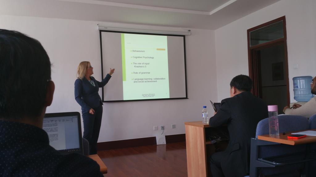 这是Cindy教授在我院的第二次讲座。本次讲座由于秀成副教授主持。在讲座中,Cindy教授系统讲授了grammar translation method、direct method等有关语言教学和语言学习的理论。讲座后,在场老师与学生对讲座内容进行了热烈交流的与讨论。通过此次讲座,我院师生对语言教学的研究有了进一步了解,大家获益颇丰。