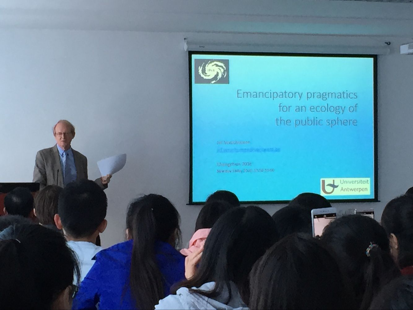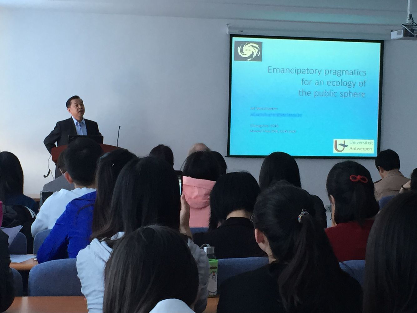 在讲座中,Jef Verschueren教授从自己的多年语用学研究实践出发,围绕Emancipatory Pragmatics,public sphere, ecology等概念为师生进行了详解。讲座内容丰富,形式轻松,师生们受益匪浅。外国语学院在校庆、院庆来临之际,将开展一系列贴近学生研究方向、紧跟学术前沿的学术活动,欢迎广大师生参加!