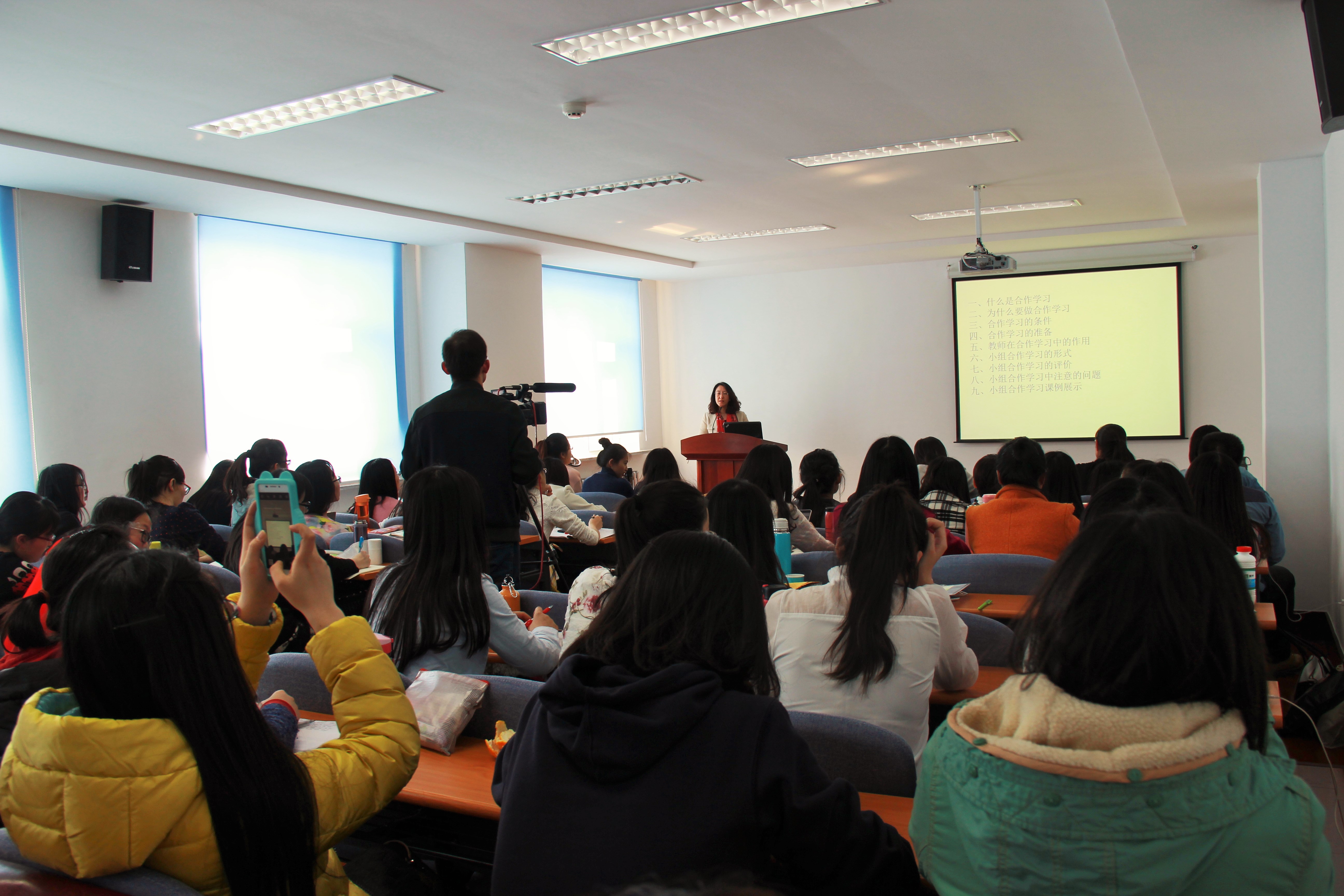 我院“卓越英语师范生培养模式研究”子课题“职前英语教师入职调试工作坊”的第三期活动于2016年3月21下午1:30-3:00在外语学院701拉开帷幕。来自东北师大附中净月校区的外语组组长乔阔老师给我院的莘莘学子们进行了主题为《中学英语课堂小组合作学习实施策略》的精彩讲座。