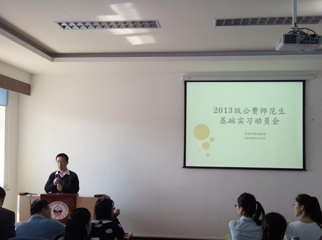 3月14日中午,英语系举行了013级公费师范生基础实习动员会。外语学院仇云龙副院长,英语系主管教育实习工作的副主任刘宏刚,本次基础实习的指导教师刘丽艳、高洪波、郭维、潘颖、何鸣以及来自外语学院英语学科教学方向的12位助研同学一同参加了此次动员会。