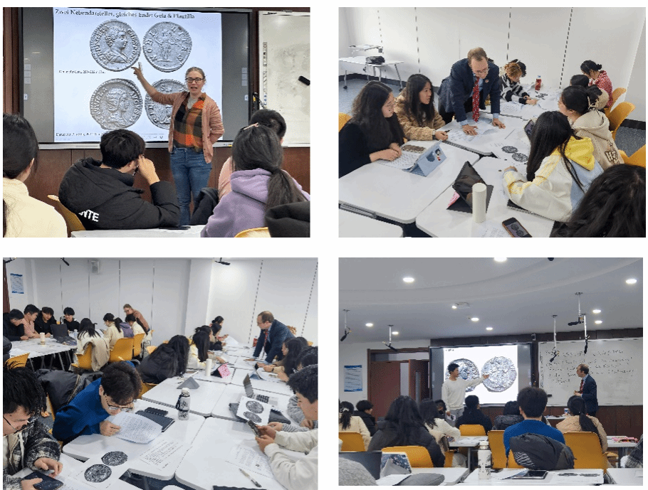 2025年3月19日,德语系第三期“德语+”拔尖创新系列学术工作坊“因高贵而美丽,抑或因美丽而高贵?——钱币上的皇室女性肖像”在东北师范大学外国语学院净月校区外语楼316智慧教室顺利举办。本次工作坊特邀东北师范大学世界古典文明史研究所教授顾斯文(Prof.Dr.Sven Günther)(德)和德国海德堡大学古典考古学院伊丽莎白博士(Dr. Elisabeth Günther)(德)担任主讲人,讲授语言为德语,德语系大二、大三年级学生及中外教师30余人参加本次工作坊。