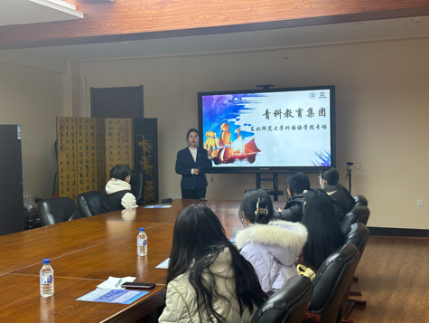 李双总监首先详细介绍了集团情况、招聘计划、人才培养等方面的信息,仇云龙副书记针对我院日俄专业优势、本科生培养等方面进行了介绍,闫兰兰老师则分享了往届毕业生去往青科教育集团实习、就业情况,以及之前参观青科教育集团淄博中心的经历。随后,曹钰婷女士面向2025届、2026届俄语专业学生进行了宣讲。