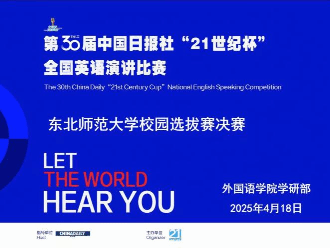 2025年4月18日晚,第30届“21世纪杯”全国大学生英语演讲比赛东北师范大学校园赛决赛在外国语学院713教室顺利举行。活动由东北师范大学外国语学院学生会主办,学研部承办,邀请了于秀成、姜言胜、刘立新、祝贺四位老师及外籍教师Russ担任评委。赛事自筹备以来,结合线上推文与线下海报等多渠道宣传,吸引了校内多个学院学生踊跃报名参赛。