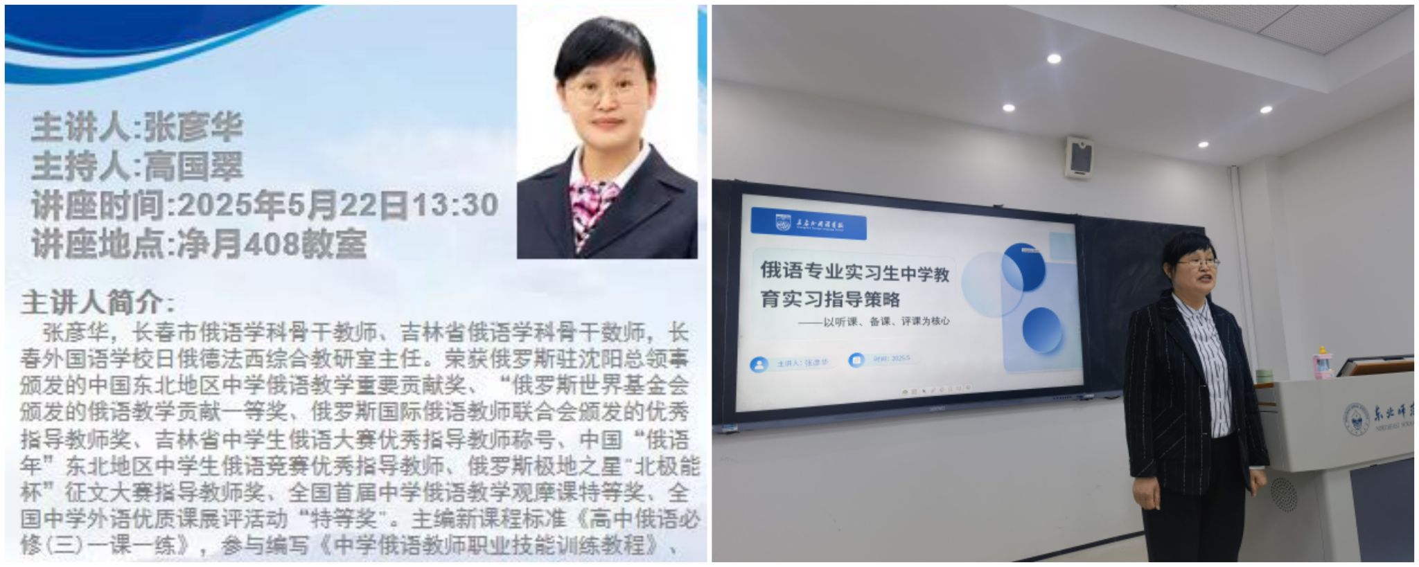 2025年5月22日,长春外国语学校日俄德法西教研室主任,吉林省俄语学科骨干教师张彦华,受邀在东北师范大学净月校区外国语学院408教室为俄语系2022级本科生做题为“俄语专业实习生中学教育实习指导策略”的讲座。
