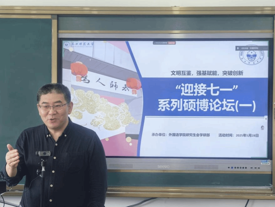 2025年5月28日下午,东北师范大学外国语学院“迎接七一”系列硕博论坛第一期在外语楼805会议室顺利举行。本次论坛特邀我院优秀博士毕业生刘晓宇与刘婉竹作专题学术分享,为广大研究生提供了宝贵的成长经验与科研指导,助力提升我院研究生人才培养质量。朱海峰教授主持论坛并对两位优秀博士毕业生的发言作出总结和点评。