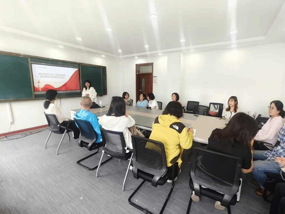 习近平总书记在5月16日《求是》杂志发表重要文章《锲而不舍落实中央八项规定精神,以优良党风引领社风民风》。大学外语系党支部深入贯彻习近平总书记关于加强党的作风建设的重要论述和中央八项规定及其精神,扎实开展深入贯彻中央八项规定精神学习教育,于5月28日进行了“贯彻落实中央八项规定精神,强化新时代师德师风建设”的主题党课,曹佩红老师作为群众代表,也参加了此次党课。