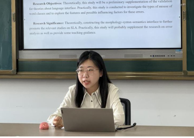 郭睿冰是2025年应届硕士毕业生,就读于外国语言学及应用语言学专业,研究方向为二语习得,硕士论文题目为《形态-句法-语义界面视角下中国英语初学者口语词类误用研究》。她以《界面视角下的语言差异对词类使用的影响》为题,深入剖析中国英语初学者口语中常出现的名词与形容词、动词过去式与动词原形以及人称代词与物主代词等混用现象,指出汉英词类在形态-句法-语义界面上的对应关系存在差异和初学者的认知模糊是造成词类误用的主要原因。她还阐释了该理论模型在数据分析中的作用,指出该研究对丰富二语习得理论和指导教学具有重要意义。