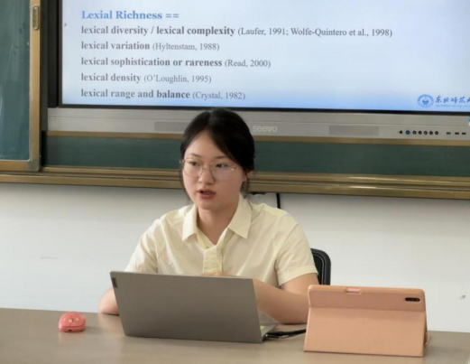 闫斯琦是2025年应届硕士毕业生,就读于外语教育专业,硕士论文题目为《初中生词汇丰富性口笔语发展特征的比较研究》。在本科期间,她连续四年获得学业奖学金和多项荣誉称号。论坛中,闫斯琦同学以《初中生词汇丰富性口笔语发展特征比较》为题,系统分析了初中生词汇丰富性在口语与书面语中的发展规律与差异特征,深入探讨口笔语发展差异的内在成因,提出提升词汇教学效能的具体建议。
