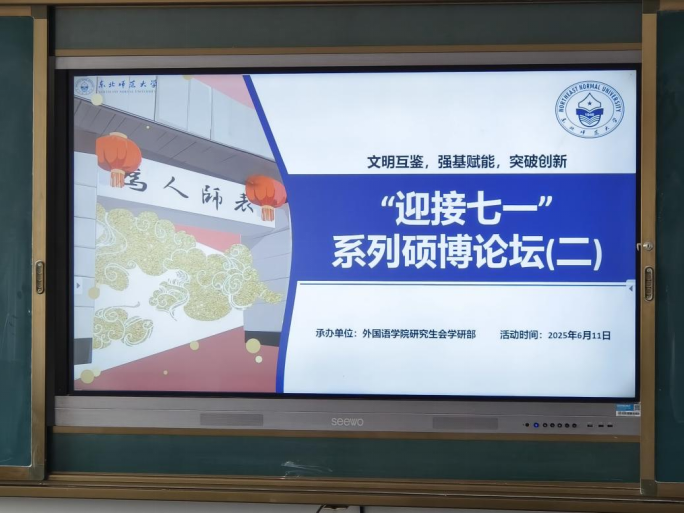 2025年6月11日下午,东北师范大学外国语学院“迎接七一”系列硕博论坛第二期在外语楼703会议室顺利举行。本次论坛特邀博士毕业生彭晨晨、硕士毕业生郭睿冰和闫斯琦作专题学术分享,为我院研究生提供前沿学术视角与科研经验指导,助力提升研究生人才培养质量。朱海峰教授主持论坛,张会平教授出席论坛,两位教授共同对三位优秀毕业生的发言作出专业点评。