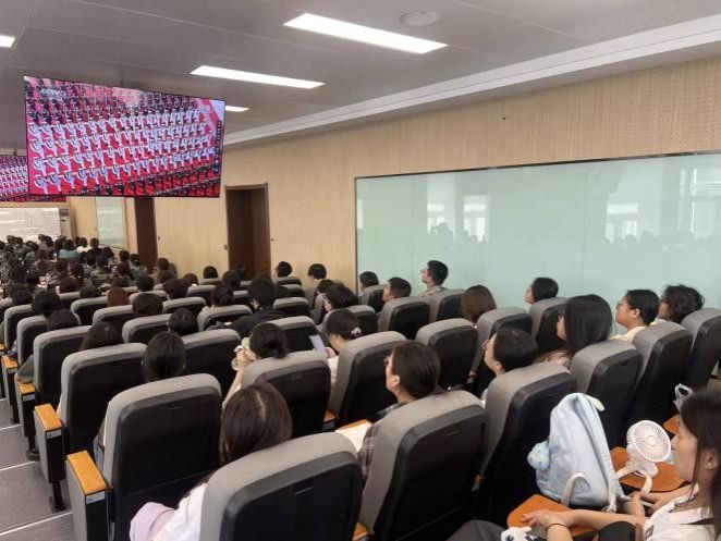 为深切缅怀革命先烈,弘扬伟大抗战精神,2025年9月3日上午9时,外国语学院师生党员在自由校区外语楼805教室、净月校区外语楼426报告厅集中观看了纪念中国人民抗日战争暨世界反法西斯战争胜利80周年阅兵大会直播。