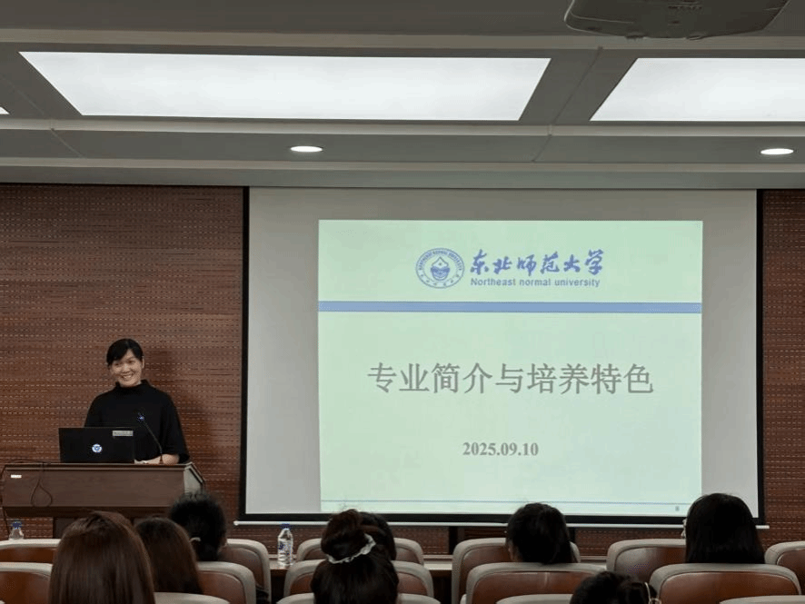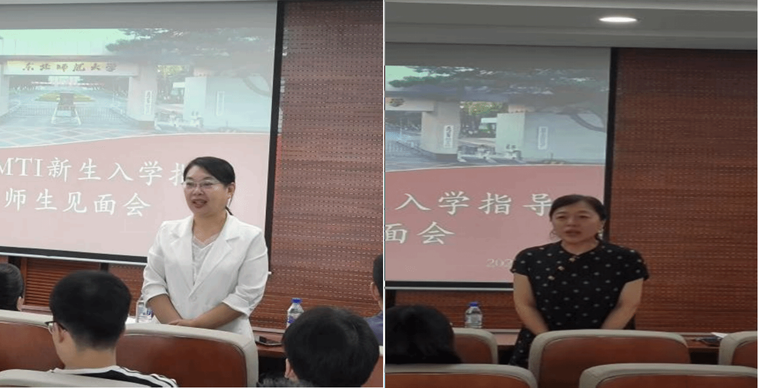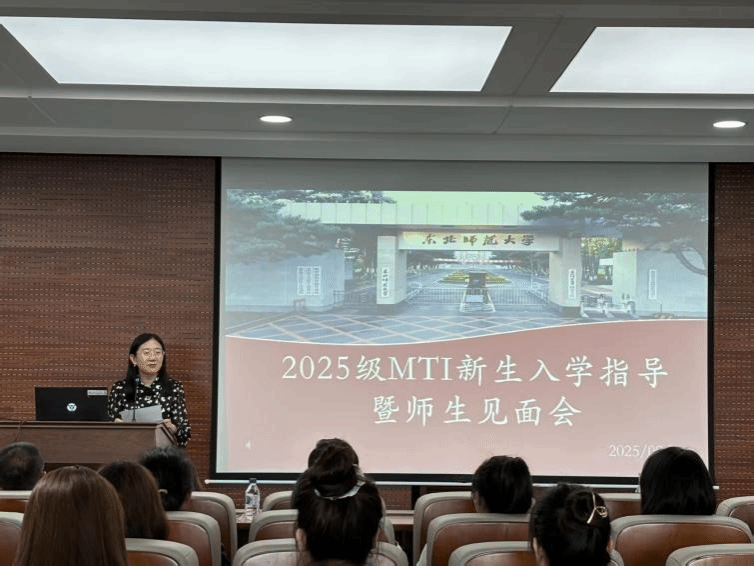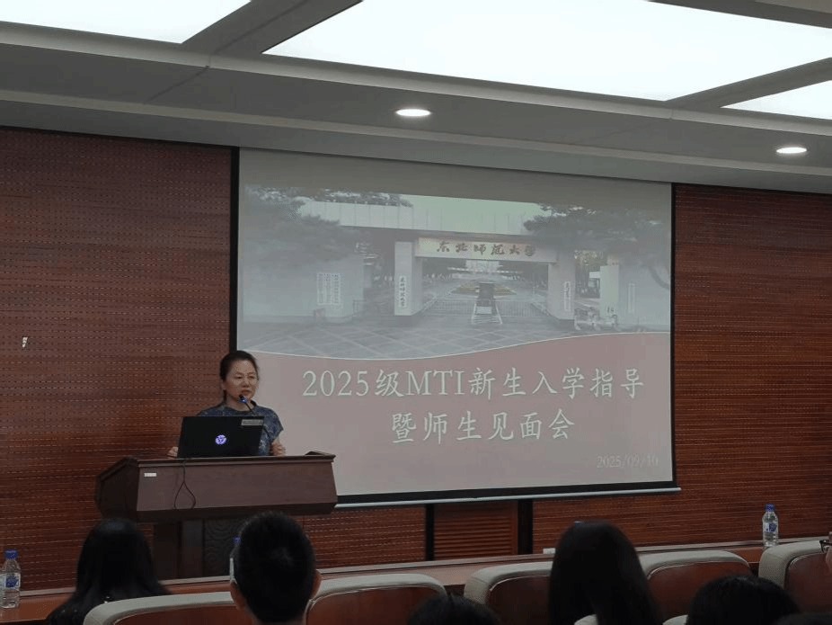翻译中心主任王畅老师随后围绕MTI培养方案与毕业要求展开详细说明,并重点介绍了导师队伍结构、论文质量管理与实习实践体系。王畅老师指出,本院MTI项目依托东北师范大学外国语学院外国语言文学一级学科优势,历经十年发展,已形成年龄结构与专业方向合理、具备丰富实践与学术经验的师资团队。在实习实践方面,王畅老师鼓励同学们积极考取翻译资格证书,主动参加各类翻译实战与国家级权威翻译赛事,不断提升自身竞争力。最后,她简要介绍了学院的奖助体系与毕业生就业情况,勉励同学们把握机会、规划学业,在东师奠定坚实的职业基础。