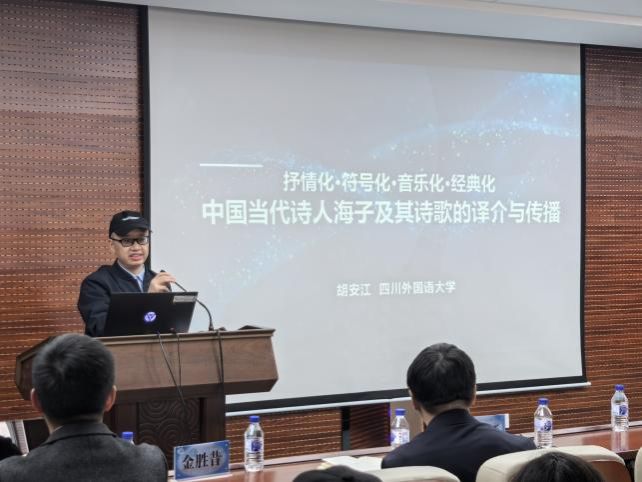 10月13日下午,我院特邀四川外国语大学副校长胡安江教授作题为《抒情化·符号化·音乐化·经典化——中国当代诗人海子及其诗歌的译介与传播》的专题报告。本次报告获得“东北师范大学哲学社会科学高水平学术交流基金项目”支持,由东北师范大学社会科学处主办,外国语学院承办。学术报告在外国语学院713室进行。外国语学院翻译方向PI金胜昔教授主持讲座。学院师生百余人到场聆听,现场学术氛围浓厚。