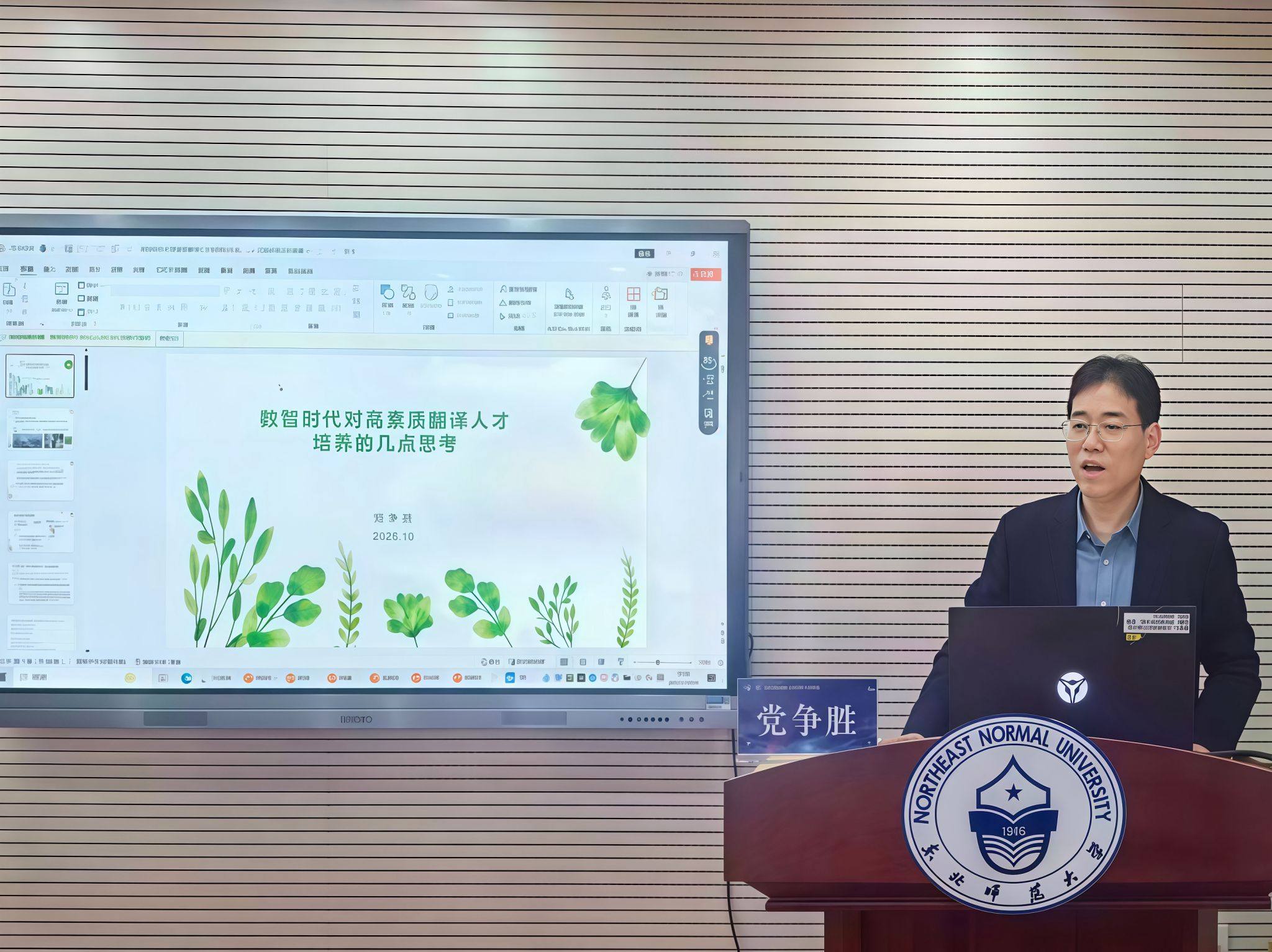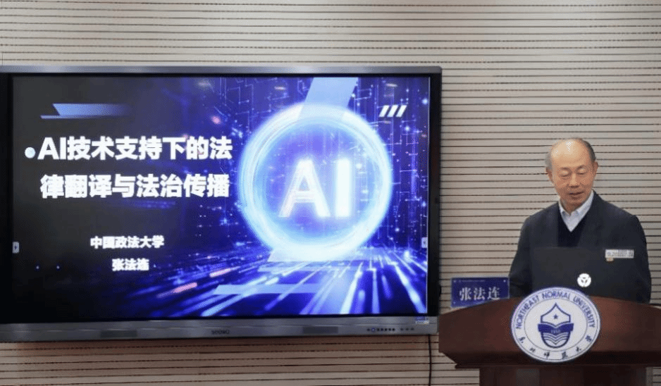 在主旨报告环节,来自西安外国语大学、中国政法大学、黑龙江大学、湖南师范大学及东北师范大学的五位专家分别作专题发言。党争胜教授围绕“数智时代对翻译专业人才培养的几点思考”,提出高端翻译人才培养需聚焦八种核心能力,并结合实例详细论证了实施路径;张法连教授以“AI技术赋能法律翻译与国际传播研究”为题,提出“技术主体性”对法治传播应用场景的深度重塑是嵌入式的,将重新赋能法治传播生态,但不可过分夸大AI的作用;孙超教授结合黑龙江大学经验,深入剖析DTI建设的关键环节;余承法教授从跨学科角度探讨“五位一体”研究生培养模式;金胜昔教授聚焦AI技术的“赋能”与“负能”双重效应,深入分析了AI时代译者能力重塑问题。报告内容思想深刻、视野开阔,赢得在场师生热烈反响。主旨报告由曲英梅教授、张宏薇教授主持。