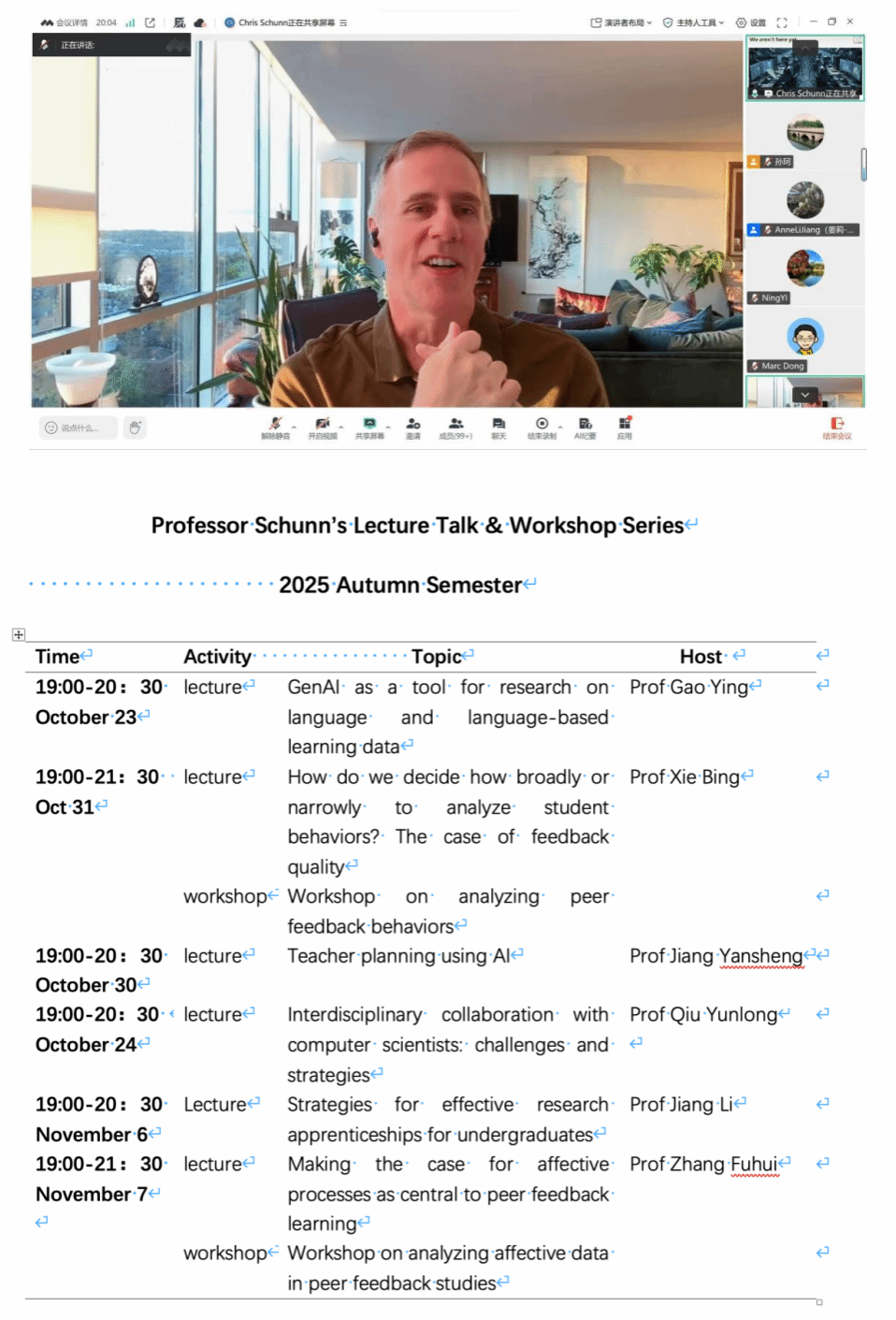 受外国语学院院长高瑛教授的邀请,美国匹斯堡大学著名语言学家Christian D. Schunn教授于2025年10月23日至11月7日期间,为我院师生开展了为期3周的语言学前沿话题系列讲座。此次活动以“人工智能与外语教学深度融合”为主题,探究了AI时代,语言学习与研究的数字化转向问题。Schunn教授的讲座共包含六场学术报告及两场专题工作坊,高瑛院长领衔主持了首场讲座“作为语言及语言学习数据研究工具的生成式人工智能”,即第128期东师外语致知讲坛。外国语学院解冰、姜言胜、仇云龙、姜莉、张福慧教授依次主持了其余各场讲座及工作坊。学院语言学、外语教学等相关方向的教师、硕/博士研究生、本科生,以及校外专家学者聆听了报告并参与讨论,每场讲座均有听众百余名。讲座期间,Schunn教授还与师生积极互动、交流,有效地实现了知识的传递与学术思想的有益碰撞。