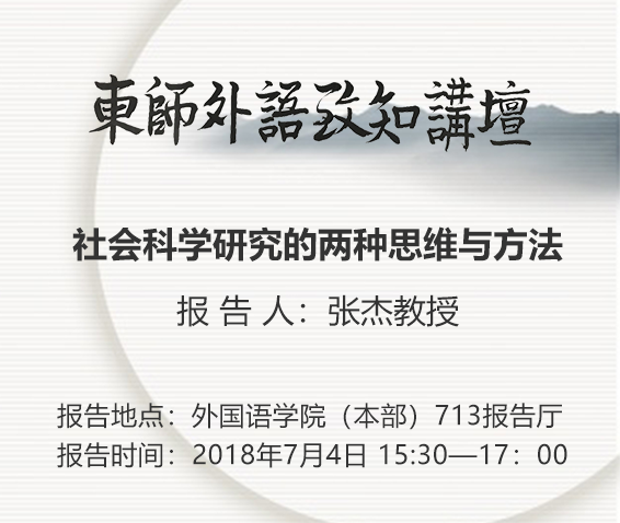 “东师外语致知讲坛”系列讲座第四十七讲——“社会科学研究的两种思维与方法”,将于7月4日开讲。具体信息如下: